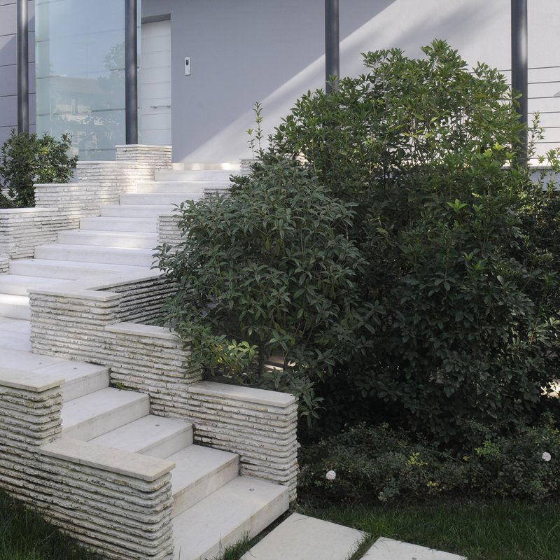 Sia l'interno che l'esterno dell'edificio sono resi preziosi dalla cura maniacale dei materiali, la cui posa è stata accuratamente disegnata in ogni dettaglio. All'interno, i marmi bianchi e neri riflettono la luce e disegnano forme geometriche che collegano in tutti gli spazi giorno e i bagni. All'esterno, la pietra bianca della Lessinia finemente lavorata disegna le scale, le barriere, i contenitori per il verde, i percorsi, la pavimentazione del porticato, e uno straordinario soggiorno all'aperto in diretto contatto con il giardino. L'aspetto artigianale della villa è esaltato dall'arredo in mobili in legno scuro curvato a vapore, in linea con la boiserie della zona giorno, contenente le armadiature a scomparsa.