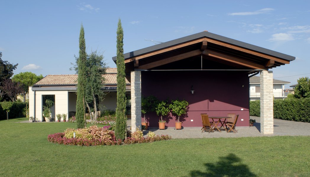 La villa รจ disposta intorno a un patio quadrato che funge da nodo distributivo e permette una razionale disposizione degli spazi con il blocco delle camere a nord e il soggiorno a sud verso il giardino.