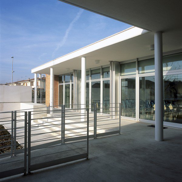 Il rigore dell'impianto planimetrico si riflette nell'articolazione volumetrica, giocata essenzialmente sul ritmo di pieni e vuoti e sull'alternarsi di muri in mattoncino e pareti in intonaco bianco.